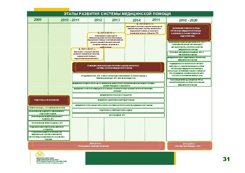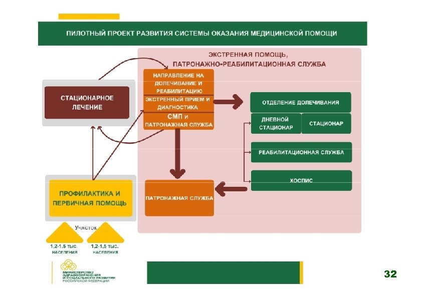 ЭТАПЫ РАЗВИТИЯ СИСТЕМЫ МЕДИЦИНСКОЙ ПОМОЩИ 2009 2010 - 2011 2012 2013 2014 2015 2016 - 2020 В. 2014 -2015 гг. Б. 2012 -2013 гг. реализация пилотного проекта перехода на саморегулируемой систему организации медицинской помощи в нескольких экспериментальных субъектах РФ планирование перехода на саморегулируемой систему организации медицинской помощи путем формирования единого уровня(III) внегоспитальной лечебной помощи, патронажа и реабилитации А. 2011 -2012 гг. ДАЛЬНЕЙШЕЕ РАЗВИТИЕ СИСТЕМЫ ОРГАНИЗАЦИИ МЕДИЦИНСКОЙ ПОМОЩИ НАСЕЛЕНИЮ НА ОСНОВЕ СОЗДАННОЙ ИНФРАСТРУКТУРЫ ДАЛЬНЕЙШЕЕ РАЗВИТИЕ ДЕЯТЕЛЬНОСТИ ЛПУ: СОВЕРШЕНСТВОВАНИЕ ОРГАНИЗАЦИИ И МЕТОДОВ РАБОТЫ, КОНТРОЛЬ КАЧЕСТВА МЕДИЦИНСКОЙ ПОМОЩИ мониторинг и текущий анализа динамики показателей качества медицинской помощи с корректировкойдеятельности ПЛАНОВОЕ ТЕКУЩЕЕ ДООСНАЩЕНИЕ ЛПУ И ОБЕСПЕЧЕНИЕ КАДРАМИ ВНЕДРЕНИЕ НОВЫХ ЭФФЕКТИВНЫХ ТЕХНОЛОГИЙ МЕДИЦИНСКОЙ ПОМОЩИ СОВЕРШЕНСТВОВАНИЕ ИНФРАСТРУКТУРЫ И ФУНКЦИОНИРОВАНИЯ СИСТЕМЫ ОКАЗАНИЯ МЕДИЦИНСКОЙ ПОМОЩИ ПОДВЕДЕНИЕ ИТОГОВ ПИЛОТНОГО ПРОЕКТА ПЕРЕХОДА НА САМОРЕГУЛИРУЕМУЮ СИСТЕМУ ОРГАНИЗАЦИИ МЕДИЦИНСКОЙ ПОМОЩИ В НЕСКОЛЬКИХ ЭКСПЕРИМЕНТАЛЬНЫХ СУБЪЕКТАХ РФ, ПРОВЕДЕНИЕ КОРРЕКТИРОВКИ ПРОЕКТА РАСШИРЕНИЕ СЕТИ ЛПУ РАЗНОГО УРОВНЯ ДЛЯ ОБЕСПЕЧЕНИЯ ЭТАПНОЙ ПОМОЩИ И ПЕРЕПРОФИЛИЗАЦИЯ ЛПУ (ПРИ НЕОБХОДИМОСТИ) ВНЕДРЕНИЕ СЛУЖБЫ ПАТРОНАЖА НА ПЕРВИЧНОМ АМБУЛАТОРНО -ПОЛИКЛИНИЧЕСКОМ УРОВНЕ И СЛУЖБЫ МАРШРУТИЗАЦИИ В СТАЦИОНАРАХ СОГЛАСНО ПОЛУЧЕННЫМ РЕЗУЛЬТАТАМ ПОЭТАПНЫЙ ПЕРЕХОД СУБЪЕКТОВ РФ НА САМОРЕГУЛИРУЕМУЮ СИСТЕМУ ОРГАНИЗАЦИИ МЕДИЦИНСКОЙ ПОМОЩИ ВНЕДРЕНИЕ ЭТАПНОСТИ МЕДИЦИНСКОЙ ПОМОЩИ И РАЗРАБОТАННЫХ МАРШРУТОВТРАНСПОРТИРОВКИ БОЛЬНЫХ ВНЕДРЕНИЕ ПРОТОКОЛОВ ИСТАНДАРТОВ ПОДГОТОВКА И ПЛАНИРОВАНИЕ ВНЕДРЕНИЕ ЭФФЕКТИВНЫХ МЕТОДОВ ПОМОЩИ ВНЕДРЕНИЕ ГОСПИТАЛЬНЫХ РЕГИСТРОВ И СИСТЕМЫ КОНТРОЛЯ КАЧЕСТВА МЕДИЦИНСКОЙ ПОМОЩИ ИНВЕНТАРИЗАЦИЯ , СОСТАВЛЕНИЕ РЕГИСТРОВ ПЛАНИРОВАНИЕ КАДРОВОГО ОБЕСПЕЧЕНИЯ И ПОДГОТОВКА КАДРОВ ПЛАНИРОВАНИЕ ПЕРЕПРОФИЛИЗАЦИИ И РАЗВИТИЯ ЛПУ ПОДГОТОВКА И ПЕРЕПОДГОТОВКА КАДРОВ ДООСНАЩЕНИЕ ЛПУ ПЛАНИРОВАНИЕ ПЕРЕОСНАЩЕНИЯ ЛПУ СОЗДАНИЕ НОРМАТИВНОЙ БАЗЫ (ВКЛЮЧАЯ СТАНДАРТЫ) РАЗРАБОТКА ИНДИКАТОРОВ КАЧЕСТВА МЕДИЦИНСКОЙ ПОМОЩИ И ПРИНЦИПОВ ОПЛАТЫ ТРУДА В ЗАВИСИМОСТИ ОТ КАЧЕСТВА ПОМОЩИ 2009 -2015 ГГ. «ПОУРОВНЕВОЕ СОВЕРШЕНСТВОВАНИЕ » 2016 -2020 ГГ. «СИСТЕМООБРАЗУЮЩИЙ» ЭТАП 31