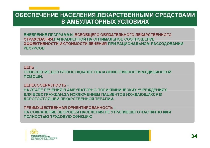 ВНЕДРЕНИЕ ПРОГРАММЫ ВСЕОБЩЕГО ОБЯЗАТЕЛЬНОГО ЛЕКАРСТВЕННОГО СТРАХОВАНИЯ НАПРАВЛЕННОЙ НА ОПТИМАЛЬНОЕ СООТНОШЕНИЕ ЭФФЕКТИВНОСТИ И СТОИМОСТИ ЛЕЧЕНИЯ ПРИ РАЦИОНАЛЬНОМ РАСХОДОВАНИИ РЕСУРСОВ ЦЕЛЬ ПОВЫШЕНИЕ ДОСТУПНОСТИ КАЧЕСТВА И ЭФФЕКТИВНОСТИ МЕДИЦИНСКОЙ ПОМОЩИ ЦЕЛЕСООБРАЗНОСТЬ НА ЭТАПЕ ЛЕЧЕНИЯ В АМБУЛАТОРНО ПОЛИКЛИНИЧЕСКИХ УЧРЕЖДЕНИЯХ ДЛЯ ВСЕХ ГРАЖДАН ЗА ИСКЛЮЧЕНИЕМ ПАЦИЕНТОВ НУЖДАЮЩИХСЯ В ДОРОГОСТОЯЩЕЙ ЛЕКАРСТВЕННОЙ ТЕРАПИИ ПРЕИМУЩЕСТВЕННАЯ ОРИЕНТИРОВАННОСТЬ НА СОХРАНЕНИЕ ЗДОРОВЬЯ НАСЕЛЕНИЯ НЕ УТРАТИВШЕГО ЧАСТИЧНО ИЛИ ПОЛНОСТЬЮ ТРУДОВУЮ ФУНКЦИЮ 34