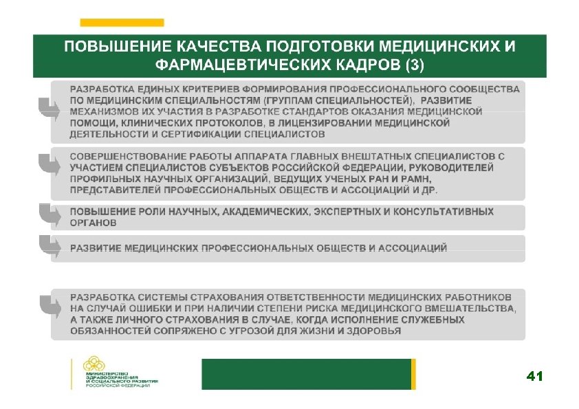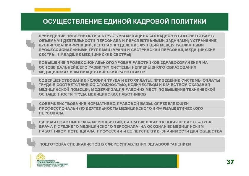 ПРИВЕДЕНИЕ ЧИСЛЕННОСТИ И СТРУКТУРЫ МЕДИЦИНСКИХ КАДРОВ В СООТВЕТСТВИЕ С ОБЪЕМАМИ ДЕЯТЕЛЬНОСТИ ПЕРСОНАЛА И ПЕРСПЕКТИВНЫМИ ЗАДАЧАМИ; УСТРАНЕНИЕ ДУБЛИРОВАНИЯ ФУНКЦИЙ, ПЕРЕРАСПРЕДЕЛЕНИЕ ФУНКЦИЙ МЕЖДУ РАЗЛИЧНЫМИ ПРОФЕССИОНАЛЬНЫМИ ГРУППАМИ (ВРАЧИ И СЕСТРИНСКИЙ ПЕРСОНАЛ, МЕДИЦИНСКИЕ СЕСТРЫ И МЛАДШИЕ МЕДИЦИНСКИЕ СЕСТРЫ) ПОВЫШЕНИЕ ПРОФЕССИОНАЛЬНОГО УРОВНЯ РАБОТНИКОВ ЗДРАВООХРАНЕНИЯ НА ОСНОВЕ ДАЛЬНЕЙШЕГО РАЗВИТИЯ СИСТЕМЫ НЕПРЕРЫВНОГО ОБРАЗОВАНИЯ МЕДИЦИНСКИХ И ФАРМАЦЕВТИЧЕСКИХ РАБОТНИКОВ СОВЕРШЕНСТВОВАНИЕ УСЛОВИЙ ТРУДА И ЕГО ОПЛАТЫ; ПРИВЕДЕНИЕ СИСТЕМЫ ОПЛАТЫ ТРУДА В СООТВЕТСТВИЕ СО СЛОЖНОСТЬЮ, КОЛИЧЕСТВОМ И КАЧЕСТВОМ ОКАЗАНИЯ МЕДИЦИНСКОЙ ПОМОЩИ; МОДЕРНИЗАЦИЯ РАБОЧИХ МЕСТ, ПОВЫШЕНИЕ ТЕХНИЧЕСКОЙ ОСНАЩЕННОСТИ ТРУДА МЕДИЦИНСКИХ РАБОТНИКОВ СОВЕРШЕНСТВОВАНИЕ НОРМАТИВНО-ПРАВОВОЙ БАЗЫ, ОПРЕДЕЛЯЮЩЕЙ ПРОФЕССИОНАЛЬНУЮ ДЕЯТЕЛЬНОСТЬ МЕДИЦИНСКОГО И ФАРМАЦЕВТИЧЕСКОГО ПЕРСОНАЛА РАЗРАБОТКА КОМПЛЕКСА МЕРОПРИЯТИЙ, НАПРАВЛЕННЫХ НА ПОВЫШЕНИЕ СТАТУСА ВРАЧА И СРЕДНЕГО МЕДИЦИНСКОГО ПЕРСОНАЛА, НА ОСОЗНАНИЕ МЕДИЦИНСКИМ РАБОТНИКОМ ПОТЕНЦИАЛА ПРОФЕССИИ И ЕЕ ПЕРСПЕКТИВ, ЗНАЧИМОСТИ ДЛЯ ОБЩЕСТВА ПОДГОТОВКА СПЕЦИАЛИСТОВ В СФЕРЕ УПРАВЛЕНИЯ ЗДРАВООХРАНЕНИЕМ 37