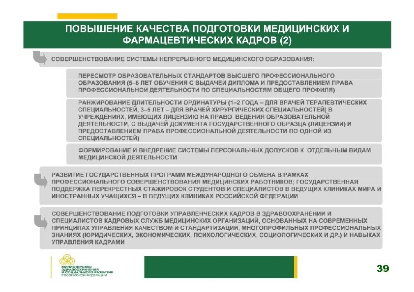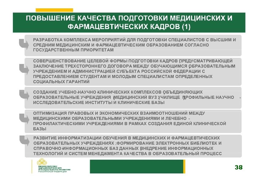 РАЗРАБОТКА КОМПЛЕКСА МЕРОПРИЯТИЙ ДЛЯ ПОДГОТОВКИ СПЕЦИАЛИСТОВ С ВЫСШИМ И СРЕДНИМ МЕДИЦИНСКИМ И ФАРМАЦЕВТИЧЕСКИМ ОБРАЗОВАНИЕМ СОГЛАСНО ГОСУДАРСТВЕННЫМ ПРИОРИТЕТАМ СОВЕРШЕНСТВОВАНИЕ ЦЕЛЕВОЙ ФОРМЫ ПОДГОТОВКИ КАДРОВ ПРЕДУСМАТРИВАЮЩЕЙ ЗАКЛЮЧЕНИЕ ТРЕХСТОРОННЕГО ДОГОВОРА МЕЖДУ ОБУЧАЮЩИМСЯ ОБРАЗОВАТЕЛЬНЫМ УЧРЕЖДЕНИЕМ И АДМИНИСТРАЦИЕЙ СУБЪЕКТА РОССИЙСКОЙ ФЕДЕРАЦИИ С ПРЕДОСТАВЛЕНИЕМ СТУДЕНТАМ И МОЛОДЫМ СПЕЦИАЛИСТАМ ОПРЕДЕЛЕННЫХ СОЦИАЛЬНЫХ ГАРАНТИЙ СОЗДАНИЕ УЧЕБНО НАУЧНО КЛИНИЧЕСКИХ КОМПЛЕКСОВ ОБЪЕДИНЯЮЩИХ ОБРАЗОВАТЕЛЬНЫЕ УЧРЕЖДЕНИЯ МЕДИЦИНСКИЙ ВУЗ УЧИЛИЩЕ ПРОФИЛЬНЫЕ НАУЧНО ИССЛЕДОВАТЕЛЬСКИЕ ИНСТИТУТЫ И КЛИНИЧЕСКИЕ БАЗЫ ОПТИМИЗАЦИЯ ПРАВОВЫХ И ЭКОНОМИЧЕСКИХ ВЗАИМООТНОШЕНИЙ МЕЖДУ МЕДИЦИНСКИМИ ОБРАЗОВАТЕЛЬНЫМИ УЧРЕЖДЕНИЯМИ И ЛЕЧЕБНО ПРОФИЛАКТИЧЕСКИМИ УЧРЕЖДЕНИЯМИ В РАМКАХ СОЗДАНИЯ ЕДИНОЙ КЛИНИЧЕСКОЙ БАЗЫ РАЗВИТИЕ ИНФОРМАТИЗАЦИИ ОБУЧЕНИЯ В МЕДИЦИНСКИХ И ФАРМАЦЕВТИЧЕСКИХ ОБРАЗОВАТЕЛЬНЫХ УЧРЕЖДЕНИЯХ ФОРМИРОВАНИЕ ЭЛЕКТРОННЫХ БИБЛИОТЕК И СПРАВОЧНО ИНФОРМАЦИОННЫХ БАЗ ДАННЫХ ВНЕДРЕНИЕ ИНФОРМАЦИОННЫХ ТЕХНОЛОГИЙ И СИСТЕМ МЕНЕДЖМЕНТА КАЧЕСТВА В ОБРАЗОВАТЕЛЬНЫЙ ПРОЦЕСС 38