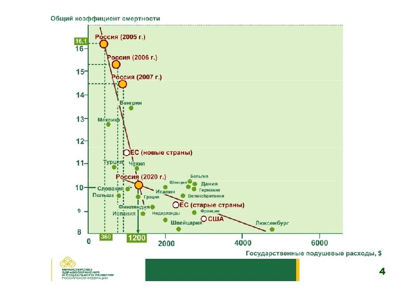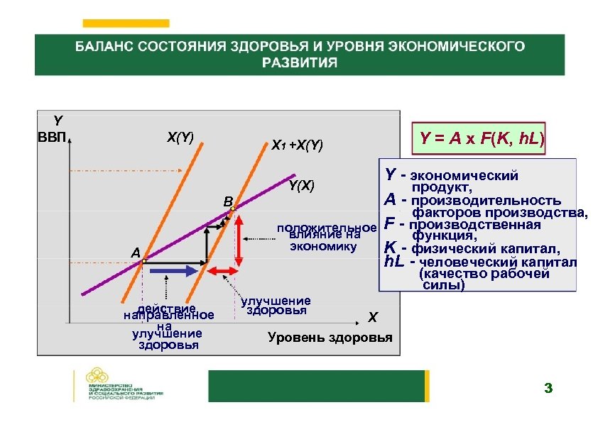 Y ВВП Х(Y) Y(Х) B А Y = A x F(K, h. L) Х 1 +Х(Y) положительное влияние на экономику Y - экономический продукт, А - производительность факторов производства, F - производственная функция, K - физический капитал, h. L - человеческий капитал (качество рабочей силы) действие, направленное на улучшение здоровья Х Уровень здоровья 3