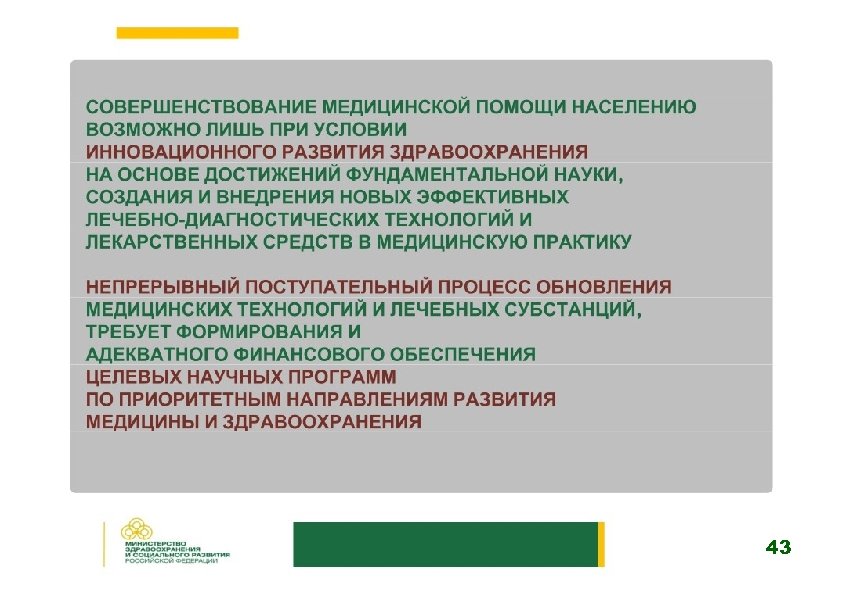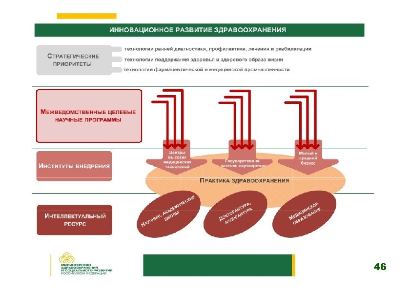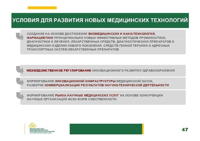 СОЗДАНИЕ НА ОСНОВЕ ДОСТИЖЕНИЙ БИОМЕДИЦИНСКИХ И НАНО-ТЕХНОЛОГИЙ, ФАРМАЦЕВТИКИ ПРИНЦИПИАЛЬНО НОВЫХ ЭФФЕКТИВНЫХ МЕТОДОВ ПРОФИЛАКТИКИ, ДИАГНОСТИКИ И ЛЕЧЕНИЯ, ЛЕКАРСТВЕННЫХ СРЕДСТВ, ДИАГНОСТИЧЕСКИХ ПРЕПАРАТОВ И МЕДИЦИНСКИХ ИЗДЕЛИЙ НОВОГО ПОКОЛЕНИЯ, СРЕДСТВ ГЕННОЙ ТЕРАПИИ И АДРЕСНЫХ ТРАНСПОРТНЫХ СИСТЕМ ЛЕКАРСТВЕННЫХ ПРЕПАРАТОВ МЕЖВЕДОМСТВЕННОЕ РЕГУЛИРОВАНИЕ ИННОВАЦИОННОГО РАЗВИТИЯ ЗДРАВООХРАНЕНИЯ ФОРМИРОВАНИЕ ИННОВАЦИОННОЙ ИНФРАСТРУКТУРЫ МЕДИЦИНСКОЙ НАУКИ, РАЗВИТИЕ КОММЕРЦИАЛИЗАЦИИ РЕЗУЛЬТАТОВ НАУЧНО-ТЕХНИЧЕСКОЙ ДЕЯТЕЛЬНОСТИ ФОРМИРОВАНИЕ РЫНКА НАУЧНЫХ МЕДИЦИНСКИХ УСЛУГ НА ОСНОВЕ КОНКУРЕНЦИИ НАУЧНЫХ ОРГАНИЗАЦИЙ ВСЕХ ФОРМ СОБСТВЕННОСТИ 47