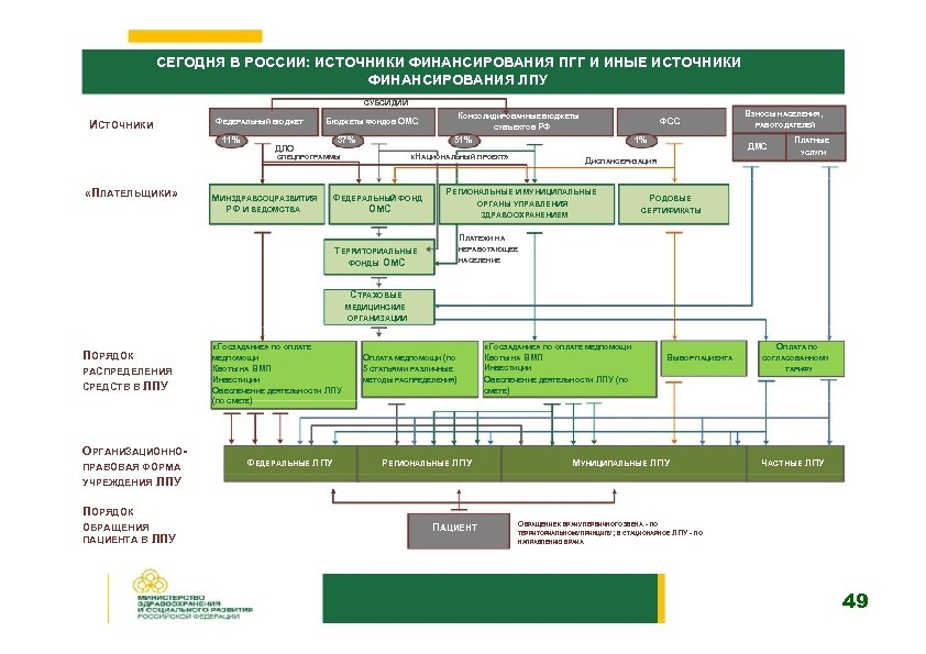 СЕГОДНЯ В РОССИИ: ИСТОЧНИКИ ФИНАНСИРОВАНИЯ ПГГ И ИНЫЕ ИСТОЧНИКИ ФИНАНСИРОВАНИЯ ЛПУ СУБСИДИИ ФЕДЕРАЛЬНЫЙ БЮДЖЕТ ИСТОЧНИКИ 11% БЮДЖЕТЫ ФОНДОВ ОМС 37% ДЛО МИНЗДРАВСОЦРАЗВИТИЯ РФ И ВЕДОМСТВА ФСС 51% 1% «НАЦИОНАЛЬНЫЙ ПРОЕКТ» СПЕЦПРОГРАММЫ «ПЛАТЕЛЬЩИКИ» КОНСОЛИДИРОВАННЫЕ БЮДЖЕТЫ СУБЪЕКТОВ РФ ФЕДЕРАЛЬНЫЙ ФОНД ОМС ВЗНОСЫ НАСЕЛЕНИЯ, РАБОТОДАТЕЛЕЙ ДМС ПЛАТНЫЕ УСЛУГИ ДИСПАНСЕРИЗАЦИЯ РЕГИОНАЛЬНЫЕ И МУНИЦИПАЛЬНЫЕ ОРГАНЫ УПРАВЛЕНИЯ РОДОВЫЕ СЕРТИФИКАТЫ ЗДРАВООХРАНЕНИЕМ ПЛАТЕЖИ НА ТЕРРИТОРИАЛЬНЫЕ ФОНДЫ ОМС НЕРАБОТАЮЩЕЕ НАСЕЛЕНИЕ СТРАХОВЫЕ МЕДИЦИНСКИЕ ОРГАНИЗАЦИИ «ГОСЗАДАНИЕ» ПО ОПЛАТЕ ПОРЯДОК МЕДПОМОЩИ РАСПРЕДЕЛЕНИЯ СРЕДСТВ В ЛПУ ОРГАНИЗАЦИОННОПРАВОВАЯ ФОРМА УЧРЕЖДЕНИЯ КВОТЫ НА ВМП ИНВЕСТИЦИИ ОБЕСПЕЧЕНИЕ ДЕЯТЕЛЬНОСТИ ЛПУ (ПО СМЕТЕ) ФЕДЕРАЛЬНЫЕ ЛПУ ОПЛАТА МЕДПОМОЩИ (ПО 5 СТАТЬЯМ И РАЗЛИЧНЫЕ МЕТОДЫ РАСПРЕДЕЛЕНИЯ) РЕГИОНАЛЬНЫЕ ЛПУ «ГОСЗАДАНИЕ» ПО ОПЛАТЕ МЕДПОМОЩИ КВОТЫ НА ВМП ИНВЕСТИЦИИ ОБЕСПЕЧЕНИЕ ДЕЯТЕЛЬНОСТИ ЛПУ (ПО СМЕТЕ) ОПЛАТА ПО ВЫБОР ПАЦИЕНТА МУНИЦИПАЛЬНЫЕ ЛПУ СОГЛАСОВАННОМУ ТАРИФУ ЧАСТНЫЕ ЛПУ ПОРЯДОК ОБРАЩЕНИЯ ПАЦИЕНТА В ЛПУ ПАЦИЕНТ ОБРАЩЕНИЕ К ВРАЧУ ПЕРВИЧНОГО ЗВЕНА - ПО ТЕРРИТОРИАЛЬНОМУ ПРИНЦИПУ ; В СТАЦИОНАРНОЕ ЛПУ - ПО НАПРАВЛЕНИЮ ВРАЧА 49