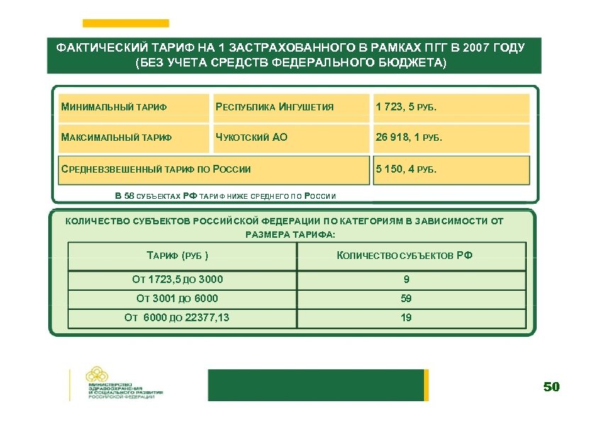 ФАКТИЧЕСКИЙ ТАРИФ НА 1 ЗАСТРАХОВАННОГО В РАМКАХ ПГГ В 2007 ГОДУ (БЕЗ УЧЕТА СРЕДСТВ ФЕДЕРАЛЬНОГО БЮДЖЕТА) МИНИМАЛЬНЫЙ ТАРИФ РЕСПУБЛИКА ИНГУШЕТИЯ 1 723, 5 РУБ. МАКСИМАЛЬНЫЙ ТАРИФ ЧУКОТСКИЙ АО 26 918, 1 РУБ. СРЕДНЕВЗВЕШЕННЫЙ ТАРИФ ПО РОССИИ 5 150, 4 РУБ. В 58 СУБЪЕКТАХ РФ ТАРИФ НИЖЕ СРЕДНЕГО ПО РОССИИ КОЛИЧЕСТВО СУБЪЕКТОВ РОССИЙСКОЙ ФЕДЕРАЦИИ ПО КАТЕГОРИЯМ В ЗАВИСИМОСТИ ОТ РАЗМЕРА ТАРИФА: ТАРИФ (РУБ ) КОЛИЧЕСТВО СУБЪЕКТОВ РФ ОТ 1723, 5 ДО 3000 9 ОТ 3001 ДО 6000 59 ОТ 6000 ДО 22377, 13 19 50