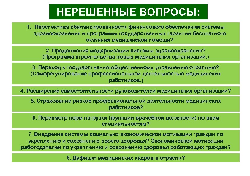 НЕРЕШЕННЫЕ ВОПРОСЫ: 1. Перспектива сбалансированности финансового обеспечения системы здравоохранения и программы государственных гарантий бесплатного оказания медицинской помощи? 2. Продолжение модернизации системы здравоохранения? (Программа строительства новых медицинских организаций. ) 3. Переход к государственно-общественному управлению отраслью? (Саморегулирование профессиональной деятельностью медицинских работников. ) 4. Расширение самостоятельности руководителей медицинских организаций? 5. Страхование рисков профессиональной деятельности медицинских работников? 6. Пересмотр норм нагрузки (функции врачебной должности) по всем специальностям? 7. Внедрение системы социально-экономической мотивации граждан по укреплению и сохранению своего здоровья? Экономической мотивации работодателей по укреплению и сохранению здоровья работающих граждан? 8. Дефицит медицинских кадров в отрасли?