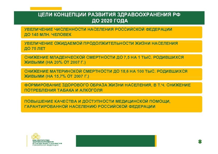 УВЕЛИЧЕНИЕ ЧИСЛЕННОСТИ НАСЕЛЕНИЯ РОССИЙСКОЙ ФЕДЕРАЦИИ ДО 145 МЛН. ЧЕЛОВЕК УВЕЛИЧЕНИЕ ОЖИДАЕМОЙ ПРОДОЛЖИТЕЛЬНОСТИ ЖИЗНИ НАСЕЛЕНИЯ ДО 75 ЛЕТ СНИЖЕНИЕ МЛАДЕНЧЕСКОЙ СМЕРТНОСТИ ДО 7, 5 НА 1 ТЫС. РОДИВШИХСЯ ЖИВЫМИ (НА 20% ОТ 2007 Г. ) СНИЖЕНИЕ МАТЕРИНСКОЙ СМЕРТНОСТИ ДО 18, 6 НА 100 ТЫС. РОДИВШИХСЯ ЖИВЫМИ (НА 15, 7% ОТ 2007 Г. ) ФОРМИРОВАНИЕ ЗДОРОВОГО ОБРАЗА ЖИЗНИ НАСЕЛЕНИЯ, В Т. Ч. СНИЖЕНИЕ ПОТРЕБЛЕНИЯ ТАБАКА И АЛКОГОЛЯ ПОВЫШЕНИЕ КАЧЕСТВА И ДОСТУПНОСТИ МЕДИЦИНСКОЙ ПОМОЩИ, ГАРАНТИРОВАННОЙ НАСЕЛЕНИЮ РОССИЙСКОЙ ФЕДЕРАЦИИ 8