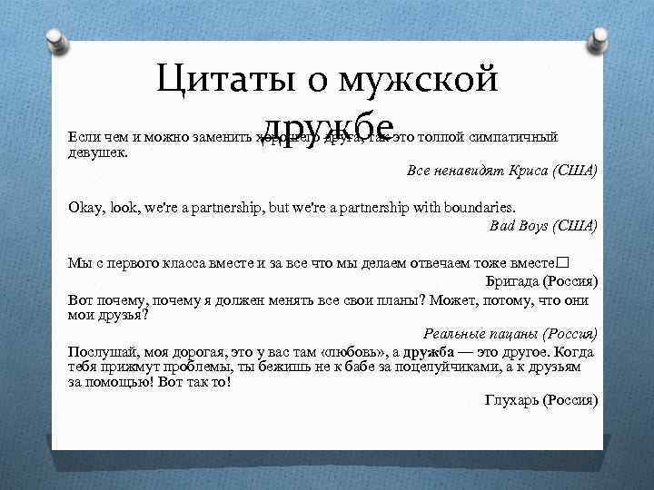 Цитаты о мужской дружбе Если чем и можно заменить хорошего друга, так это толпой симпатичный девушек. Все ненавидят Криса (США) Okay, look, we're a partnership, but we're a partnership with boundaries. Bad Boys (США) Мы с первого класса вместе и за все что мы делаем отвечаем тоже вместе . Бригада (Россия) Вот почему, почему я должен менять все свои планы? Может, потому, что они мои друзья? Реальные пацаны (Россия) Послушай, моя дорогая, это у вас там «любовь» , а дружба — это другое. Когда тебя прижмут проблемы, ты бежишь не к бабе за поцелуйчиками, а к друзьям за помощью! Вот так то! Глухарь (Россия)