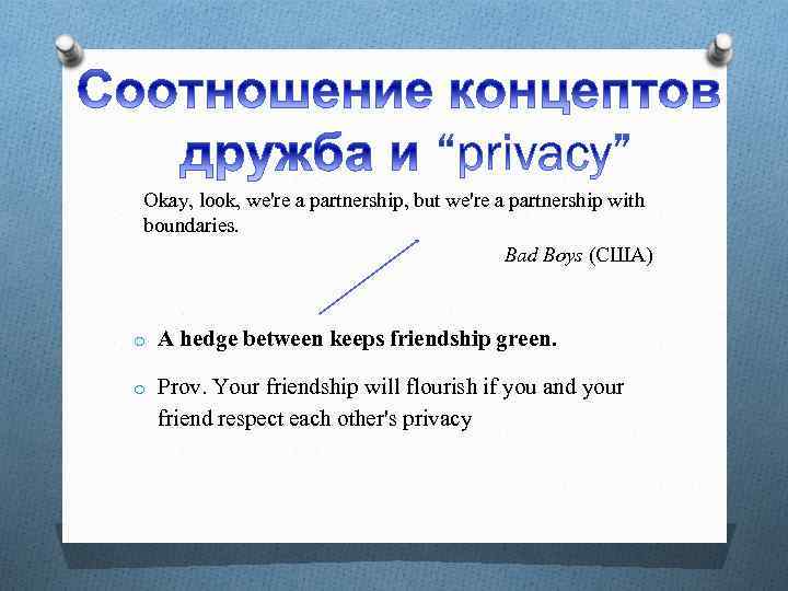 Okay, look, we're a partnership, but we're a partnership with boundaries. Bad Boys (США) o A hedge between keeps friendship green. o Prov. Your friendship will flourish if you and your friend respect each other's privacy