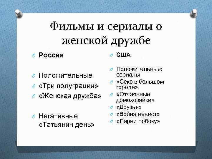 Фильмы и сериалы о женской дружбе O Россия O Положительные: O США O Положительные: O «Три полуграции» O O «Женская дружба» O O Негативные: O O O «Татьянин день» сериалы «Секс в большом городе» «Отчаянные домохозяйки» «Друзья» «Война невест» «Парни побоку»