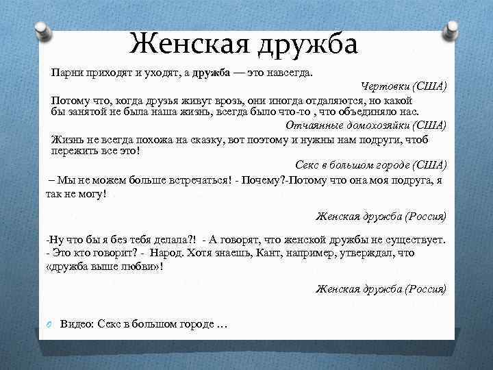Женская дружба Парни приходят и уходят, а дружба — это навсегда. Чертовки (США) Потому что, когда друзья живут врозь, они иногда отдаляются, но какой бы занятой не была наша жизнь, всегда было что-то , что объединяло нас. Отчаянные домохозяйки (США) Жизнь не всегда похожа на сказку, вот поэтому и нужны нам подруги, чтоб пережить все это! Секс в большом городе (США) – Мы не можем больше встречаться! - Почему? -Потому что она моя подруга, я так не могу! Женская дружба (Россия) -Ну что бы я без тебя делала? ! - А говорят, что женской дружбы не существует. - Это кто говорит? - Народ. Хотя знаешь, Кант, например, утверждал, что «дружба выше любви» ! Женская дружба (Россия) O Видео: Секс в большом городе …
