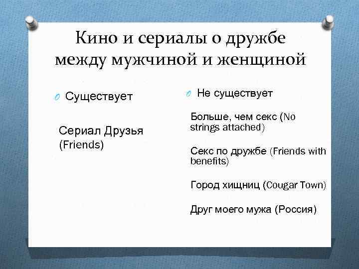Кино и сериалы о дружбе между мужчиной и женщиной O Существует Сериал Друзья (Friends) O Не существует Больше, чем секс (No strings attached) Секс по дружбе (Friends with benefits) Город хищниц (Cougar Town) Друг моего мужа (Россия)