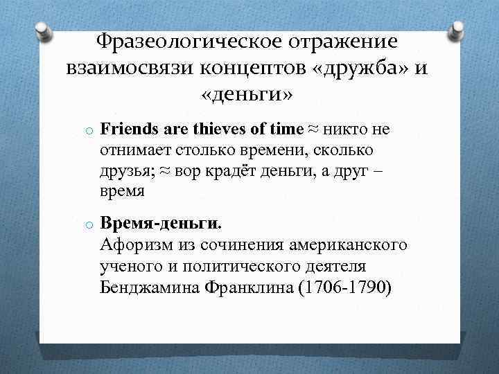Фразеологическое отражение взаимосвязи концептов «дружба» и «деньги» o Friends are thieves of time ≈ никто не отнимает столько времени, сколько друзья; ≈ вор крадёт деньги, а друг – время o Время-деньги. Афоризм из сочинения американского ученого и политического деятеля Бенджамина Франклина (1706 -1790)