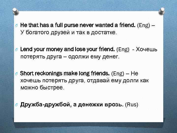 O He that has a full purse never wanted a friend. (Eng) – У богатого друзей и так в достатке. O Lend your money and lose your friend. (Eng) - Хочешь потерять друга – одолжи ему денег. O Short reckonings make long friends. (Eng) – Не хочешь потерять друга, отдавай ему долги как можно быстрее. O Дружба-дружбой, а денежки врозь. (Rus)