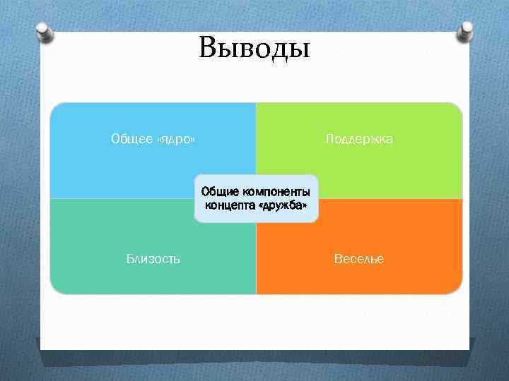 Выводы Поддержка Общее «ядро» Общие компоненты концепта «дружба» Близость Веселье