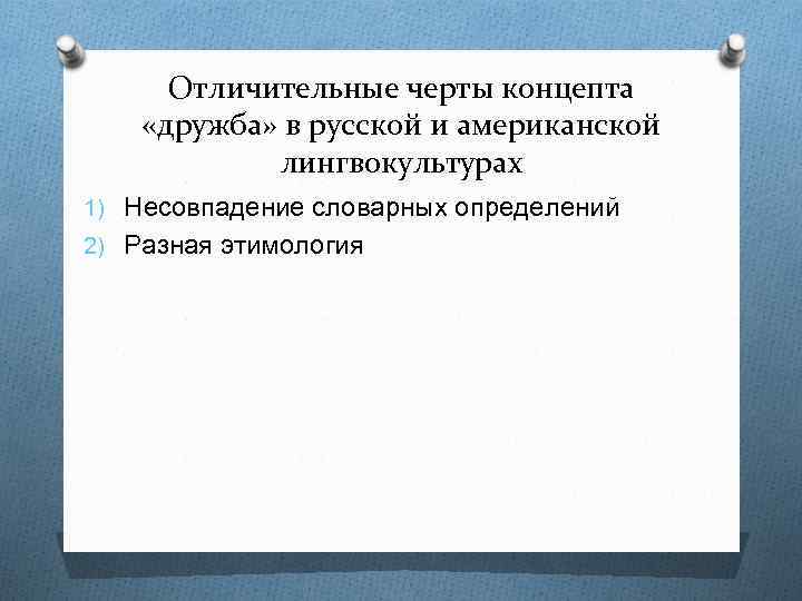 Отличительные черты концепта «дружба» в русской и американской лингвокультурах 1) Несовпадение словарных определений 2) Разная этимология