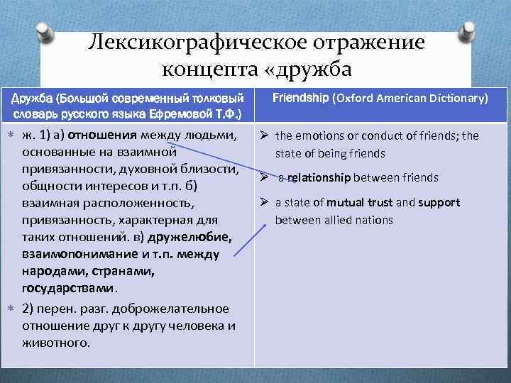 Лексикографическое отражение концепта «дружба Дружба (Большой современный толковый словарь русского языка Ефремовой Т. Ф. ) ж. 1) а) отношения между людьми, основанные на взаимной привязанности, духовной близости, общности интересов и т. п. б) взаимная расположенность, привязанность, характерная для таких отношений. в) дружелюбие, взаимопонимание и т. п. между народами, странами, государствами. 2) перен. разг. доброжелательное отношение друг к другу человека и животного. Friendship (Oxford American Dictionary) Ø the emotions or conduct of friends; the state of being friends Ø a relationship between friends Ø a state of mutual trust and support between allied nations