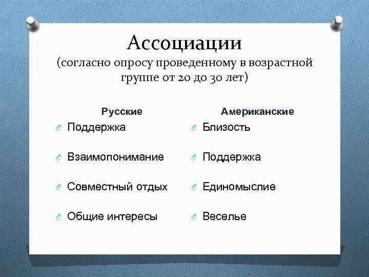 Ассоциации (согласно опросу проведенному в возрастной группе от 20 до 30 лет) Русские Американские O Поддержка O Близость O Взаимопонимание O Поддержка O Совместный отдых O Единомыслие O Общие интересы O Веселье