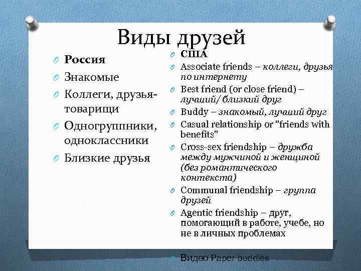 Виды друзей O Россия O Знакомые O Коллеги, друзья- товарищи O Одногруппники, одноклассники O Близкие друзья O США O Associate friends – коллеги, друзья O O O по интернету Best friend (or close friend) – лучший/ близкий друг Buddy – знакомый, лучший друг Casual relationship or "friends with benefits" Cross-sex friendship – дружба между мужчиной и женщиной (без романтического контекста) Communal friendship – группа друзей Agentic friendship – друг, помогающий в работе, учебе, но не в личных проблемах O Видео Paper buddies