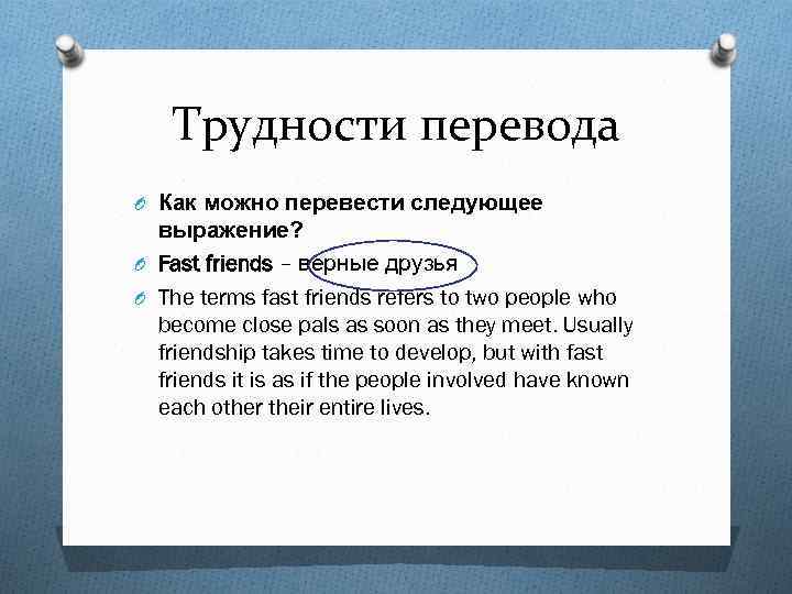 Трудности перевода O Как можно перевести следующее выражение? O Fast friends – верные друзья O The terms fast friends refers to two people who become close pals as soon as they meet. Usually friendship takes time to develop, but with fast friends it is as if the people involved have known each other their entire lives.