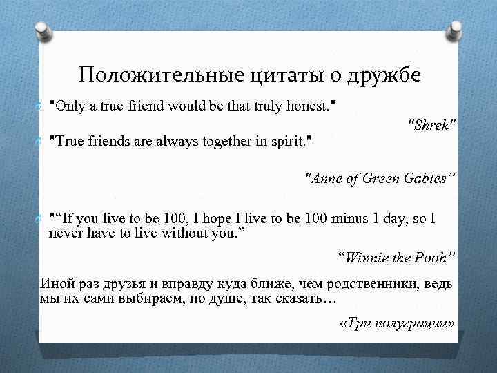 Положительные цитаты о дружбе O "Only a true friend would be that truly honest. " O "True friends are always together in spirit. " "Shrek" "Anne of Green Gables” O "“If you live to be 100, I hope I live to be 100 minus 1 day, so I never have to live without you. ” “Winnie the Pooh” Иной раз друзья и вправду куда ближе, чем родственники, ведь мы их сами выбираем, по душе, так сказать… «Три полуграции»