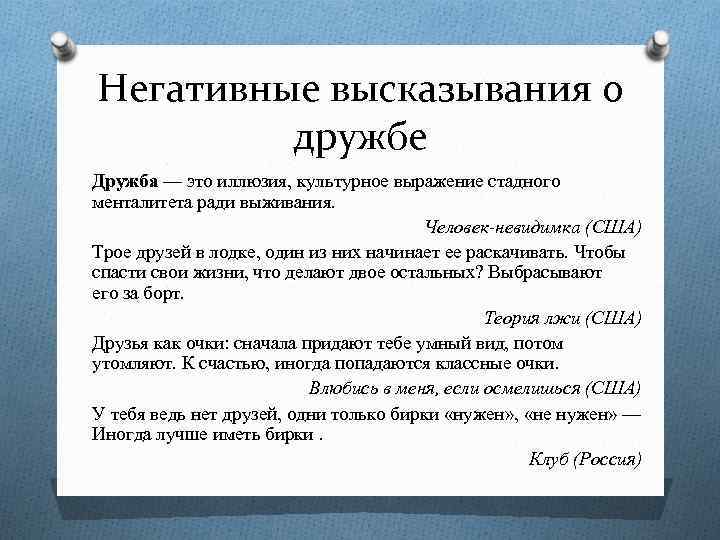 Негативные высказывания о дружбе Дружба — это иллюзия, культурное выражение стадного менталитета ради выживания. Человек-невидимка (США) Трое друзей в лодке, один из них начинает ее раскачивать. Чтобы спасти свои жизни, что делают двое остальных? Выбрасывают его за борт. Теория лжи (США) Друзья как очки: сначала придают тебе умный вид, потом утомляют. К счастью, иногда попадаются классные очки. Влюбись в меня, если осмелишься (США) У тебя ведь нет друзей, одни только бирки «нужен» , «не нужен» — Иногда лучше иметь бирки. Клуб (Россия)