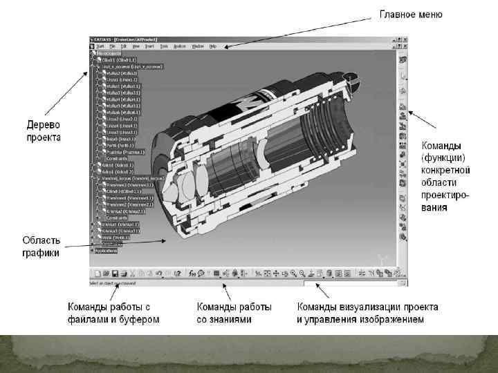 Содержание предметных областей CATIA V 5 Машиностроительное проектирование (Mechanical Design). Работая в рамках данной предметной области, пользователь CATIA V 5 может решать следующий круг задач: Твердотельное и каркасно поверхностное моделирование деталей и сборочных единиц; Формирование чертежно конструкторской документации; Простановка допусков и обозначений на модели с их контролем; Импорт моделей деталей с восстановлением дерева компонентов; Проверка корректности и «лечение» импортируемой геометрии; Проектирование формообразующих элементов пресс форм и штампов; Проектирование конструкции (пакетов) формообразующей оснастки; Конструирование изделий из листового металла; Проектирование сварных конструкций; Проектирование сборок на основе каталогов и пользовательских библиотек; Проектирование конструкций из листового металла в авиастроении; Проектирование деталей из композитных материалов с использованием баз знаний; Функциональное проектирование изделий из пластмасс (т. е. с учетом их назначения, на соответствующем семантическом уровне).