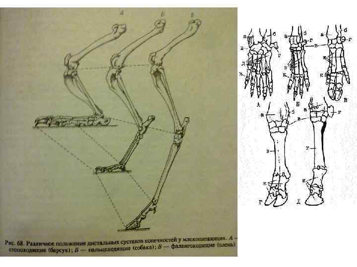 Пути развития парных конечностей • У млекопитающих сдвиг суставой в значительной степени связан с характером движения. • У видов, не отличающихся быстрым движением (медведь из отряда хищные), сохранился голеностопный сустав – стопоходящие • У животных, способных к быстрому бегу (собачьи из хищных), сустав смещается в дистальном направлении и располагается между плюсной/кистью и пальцами – пальцеходящие. • У копытных, способных к высокоскоростному движению, опора осуществляется лишь на конечные фаланги пальцев, которые могут срастаться.