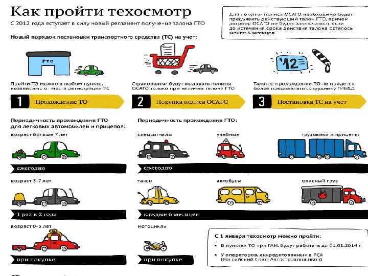 • • • 1. Автовладельцы имеют право обратиться в любой пункт технического осмотра, аккредитованный для этих целей, без привязки к месту регистрации автомобиля. Если автомобиль возрастом младше 3 лет, то, согласно закону, техосмотр он проходить не обязан. 2. Для прохождения техосмотра требуется предъявить документ, удостоверяющий личность (если на ТО автомобиль привез не владелец, то и доверенность), свидетельство о регистрации автомобиля или ПТС - паспорт технического средства. 3. Владелец подписывает типовой договор, утвержденный Минэкономразвития и вносит оплату. 4. Проверяются шесть основных узлов транспортного средства: Тормозная система. Проверятся на эффективность торможения, разность тормозных сил на оси. Осматривается на предмет коррозии, трещин, набухания и течи. Рулевое управление. Исправность усилителя. Допустимый люфт для легковушек - не более 10 градусов. Внешние световые приборы. Не допускается перенос и демонтаж фар, углы регулировки должны соответствовать ГОСТу, при нажатии на тормоз - активируются стоп-сигналы. Шины и колеса. Высота протектора - 1, 6 мм, для зимних шин - 4 мм. Размер шин на одной оси должен совпадать, никаких вздутий, порезов, диски - без трещин. Двигатель и его системы. Наличие загрязняющих веществ в выхлопе, измеряется уровень шума, не допустимы течи топлива. В салоне проверят наличие огнетушителя и знака аварийной остановки, работоспособность ремней безопасности, работу клаксона, кресла, наличие номерных знаков. 5. Время, отводимое на проведение процедуры для легковых автомобилей, составляет 30 минут, для грузовых - 32 минуты. Осмотр прицепа - 25 минут, мотоцикла - всего 10 минут. 6. Если все в порядке - выдается талон техосмотра. Если что-то не соответствует нормативам, придется оперативно устранять неисправность и снова явиться на ТО.