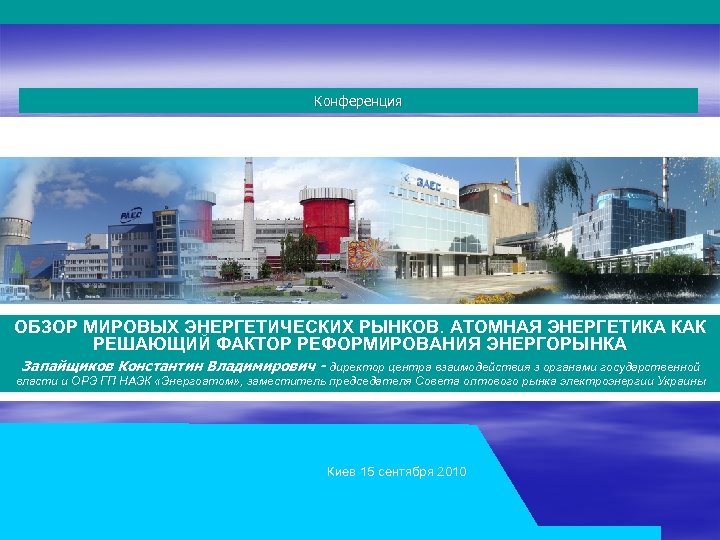 Конференция Д ОБЗОР МИРОВЫХ ЭНЕРГЕТИЧЕСКИХ РЫНКОВ. АТОМНАЯ ЭНЕРГЕТИКА КАК РЕШАЮЩИЙ ФАКТОР РЕФОРМИРОВАНИЯ ЭНЕРГОРЫНКА Запайщиков Константин Владимирович - директор центра взаимодействия з органами государственной власти и ОРЭ ГП НАЭК «Энергоатом» , заместитель председателя Совета оптового рынка электроэнергии Украины Киев 15 сентября 2010