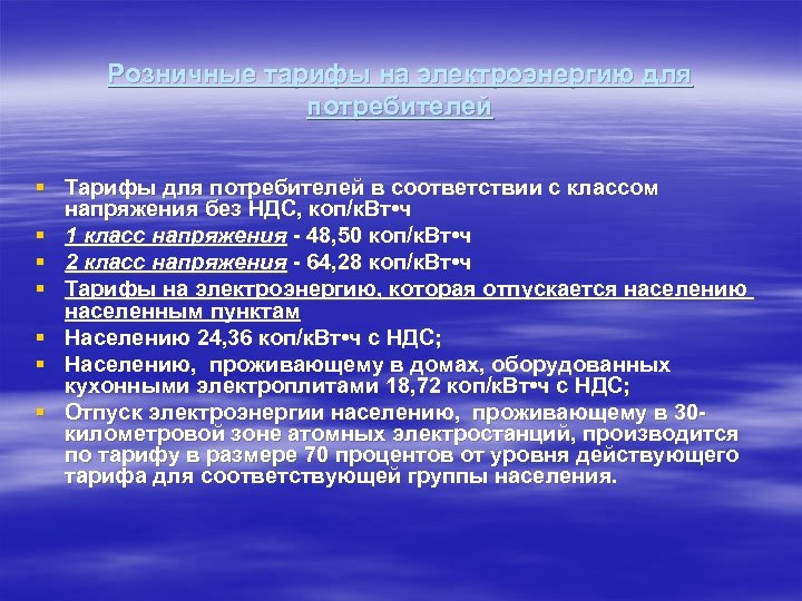 Розничные тарифы на электроэнергию для потребителей § Тарифы для потребителей в соответствии с классом напряжения без НДС, коп/к. Вт • ч § 1 класс напряжения - 48, 50 коп/к. Вт • ч § 2 класс напряжения - 64, 28 коп/к. Вт • ч § Тарифы на электроэнергию, которая отпускается населению населенным пунктам § Населению 24, 36 коп/к. Вт • ч с НДС; § Населению, проживающему в домах, оборудованных кухонными электроплитами 18, 72 коп/к. Вт • ч с НДС; § Отпуск электроэнергии населению, проживающему в 30 километровой зоне атомных электростанций, производится по тарифу в размере 70 процентов от уровня действующего тарифа для соответствующей группы населения.