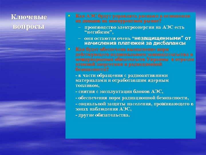 Ключевые вопросы § Как АЭС будут управлять рисками в отношении их доходов на конкурентном рынке? – производство электроэнергии на АЭС есть “негибким”, – они остаются очень “незащищенными” от начисления платежей за дисбалансы § Как будет обеспечено выполнение норм действующего национального законодательства и международных обязательств Украины в отрасли атомной энергетики и радиационной безопасности? - в части обращения с радиоактивними материалами и отработавшим ядерным топливом, - снятия с эксплуатации блоков АЭС, - обеспечения норм радиационной безопасности, - социальной защиты населения, проживающего в зонах наблюдения АЭС, - другие обязательства.