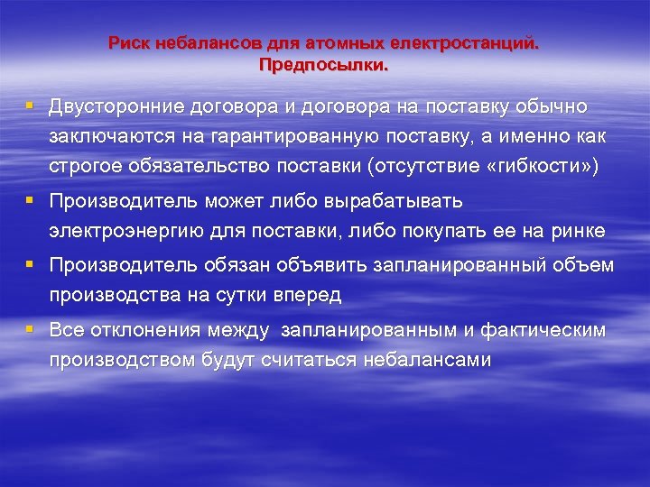 Риск небалансов для атомных електростанций. Предпосылки. § Двусторонние договора и договора на поставку обычно заключаются на гарантированную поставку, а именно как строгое обязательство поставки (отсутствие «гибкости» ) § Производитель может либо вырабатывать электроэнергию для поставки, либо покупать ее на ринке § Производитель обязан объявить запланированный объем производства на сутки вперед § Все отклонения между запланированным и фактическим производством будут считаться небалансами