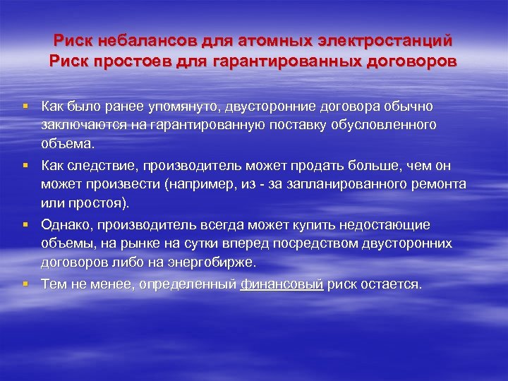 Риск небалансов для атомных электростанций Риск простоев для гарантированных договоров § Как было ранее упомянуто, двусторонние договора обычно заключаются на гарантированную поставку обусловленного объема. § Как следствие, производитель может продать больше, чем он может произвести (например, из - за запланированного ремонта или простоя). § Однако, производитель всегда может купить недостающие объемы, на рынке на сутки вперед посредством двусторонних договоров либо на энергобирже. § Тем не менее, определенный финансовый риск остается.