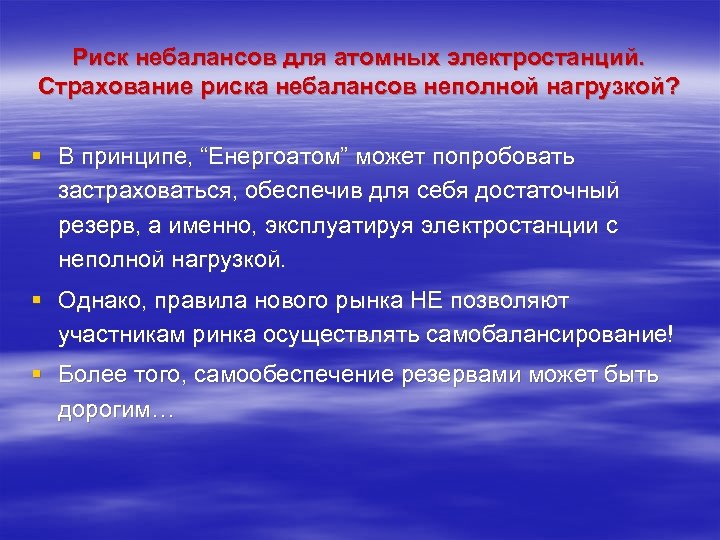 Риск небалансов для атомных электростанций. Страхование риска небалансов неполной нагрузкой? § В принципе, “Енергоатом” может попробовать застраховаться, обеспечив для себя достаточный резерв, а именно, эксплуатируя электростанции с неполной нагрузкой. § Однако, правила нового рынка НЕ позволяют участникам ринка осуществлять самобалансирование! § Более того, самообеспечение резервами может быть дорогим…