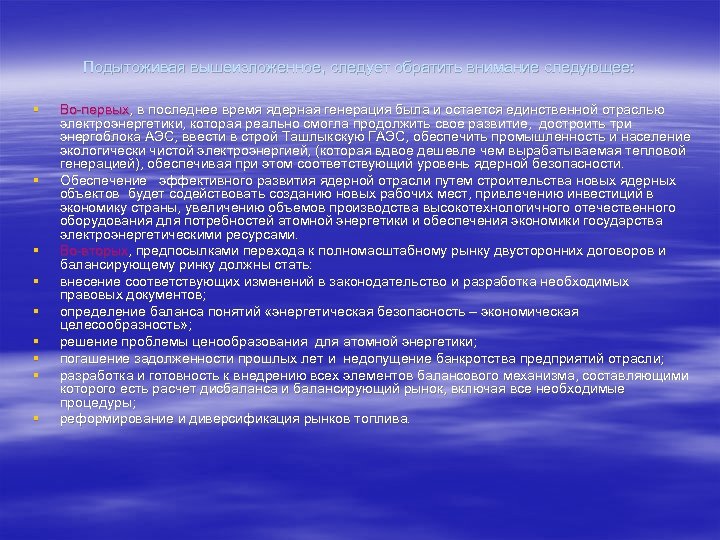 Подытоживая вышеизложенное, следует обратить внимание следующее: § § § § § Во-первых, в последнее время ядерная генерация была и остается единственной отраслью электроэнергетики, которая реально смогла продолжить свое развитие, достроить три энергоблока АЭС, ввести в строй Ташлыкскую ГАЭС, обеспечить промышленность и население экологически чистой электроэнергией, (которая вдвое дешевле чем вырабатываемая тепловой генерацией), обеспечивая при этом соответствующий уровень ядерной безопасности. Обеспечение эффективного развития ядерной отрасли путем строительства новых ядерных объектов будет содействовать созданию новых рабочих мест, привлечению инвестиций в экономику страны, увеличению объемов производства высокотехнологичного отечественного оборудования для потребностей атомной энергетики и обеспечения экономики государства электроэнергетическими ресурсами. Во-вторых, предпосылками перехода к полномасштабному рынку двусторонних договоров и балансирующему ринку должны стать: внесение соответствующих изменений в законодательство и разработка необходимых правовых документов; определение баланса понятий «энергетическая безопасность – экономическая целесообразность» ; решение проблемы ценообразования для атомной энергетики; погашение задолженности прошлых лет и недопущение банкротства предприятий отрасли; разработка и готовность к внедрению всех элементов балансового механизма, составляющими которого есть расчет дисбаланса и балансирующий рынок, включая все необходимые процедуры; реформирование и диверсификация рынков топлива.