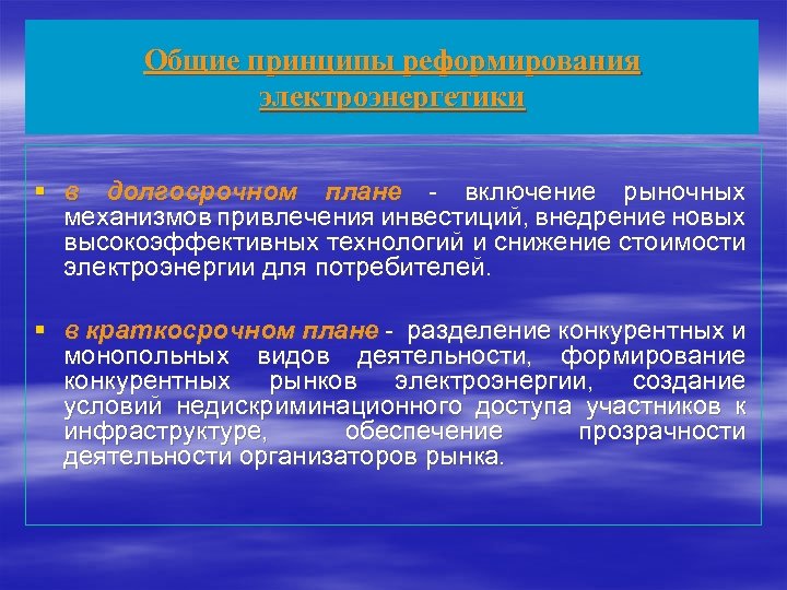 Общие принципы реформирования электроэнергетики § в долгосрочном плане - включение рыночных механизмов привлечения инвестиций, внедрение новых высокоэффективных технологий и снижение стоимости электроэнергии для потребителей. § в краткосрочном плане - разделение конкурентных и монопольных видов деятельности, формирование конкурентных рынков электроэнергии, создание условий недискриминационного доступа участников к инфраструктуре, обеспечение прозрачности деятельности организаторов рынка.