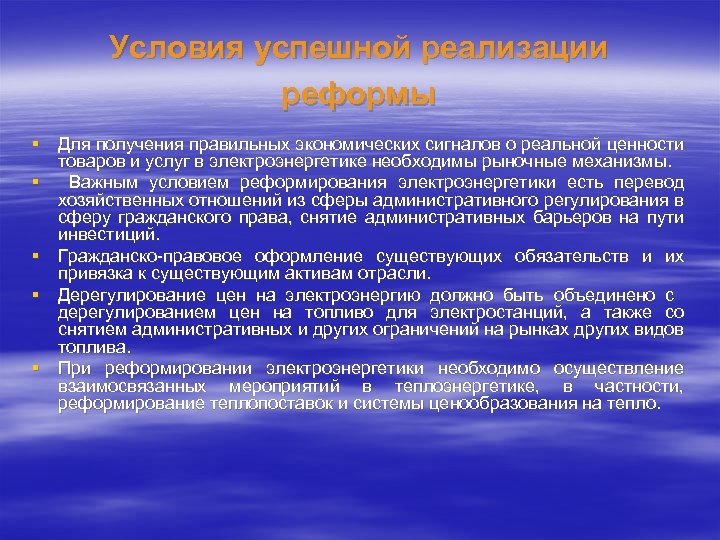 Условия успешной реализации реформы § Для получения правильных экономических сигналов о реальной ценности товаров и услуг в электроэнергетике необходимы рыночные механизмы. § Важным условием реформирования электроэнергетики есть перевод хозяйственных отношений из сферы административного регулирования в сферу гражданского права, снятие административных барьеров на пути инвестиций. § Гражданско-правовое оформление существующих обязательств и их привязка к существующим активам отрасли. § Дерегулирование цен на электроэнергию должно быть объединено с дерегулированием цен на топливо для электростанций, а также со снятием административных и других ограничений на рынках других видов топлива. § При реформировании электроэнергетики необходимо осуществление взаимосвязанных мероприятий в теплоэнергетике, в частности, реформирование теплопоставок и системы ценообразования на тепло.