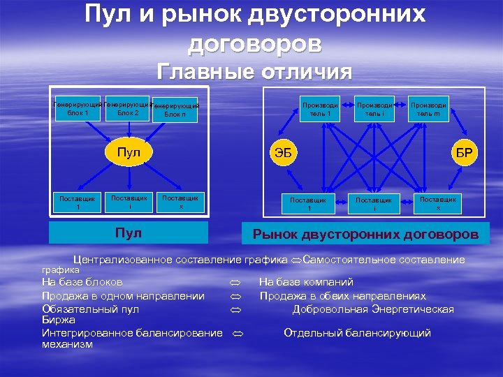 Пул и рынок двусторонних договоров Главные отличия Генерирующий блок 1 Блок 2 Блок n Производи тель 1 Пул Поставщик 1 Поставщик і Производи тель i Производи тель m ЭБ Поставщик х Поставщик 1 Пул БР Поставщик і Поставщик х Рынок двусторонних договоров Централизованное составление графика Самостоятельное составление графика На базе блоков Продажа в одном направлении Обязательный пул Биржа Интегрированное балансирование механизм На базе компаний Продажа в обеих направлениях Добровольная Энергетическая Отдельный балансирующий