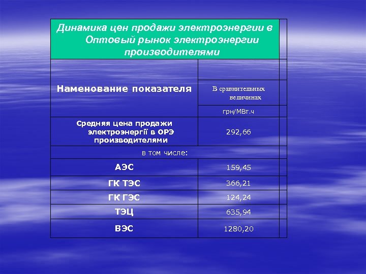 Динамика цен продажи электроэнергии в Оптовый рынок электроэнергии производителями Наменование показателя грн/МВт. ч Средняя цена продажи электроэнергії в ОРЭ производителями В сравнительных величинах 292, 66 в том числе: АЭС 159, 45 ГК ТЭС 366, 21 ГК ГЭС 124, 24 ТЭЦ 635, 94 ВЭС 1280, 20