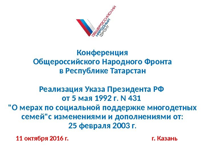 Конференция Общероссийского Народного Фронта в Республике Татарстан Реализация Указа Президента РФ от 5 мая 1992 г. N 431 «О мерах по социальной поддержке многодетных семей»с изменениями и дополнениями от: 25 февраля 2003 г. 11 октября 2016 г. г. Казань