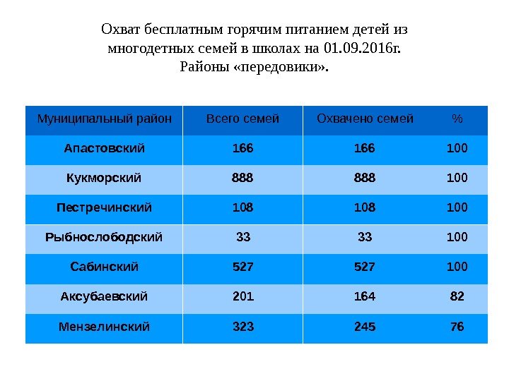 Муниципальный район Всего семей Охвачено семей % Апастовский 166 100 Кукморский 888 100 Пестречинский 108 100 Рыбнослободский 33 33 100 Сабинский 527 100 Аксубаевский 201 164 82 Мензелинский 323 245 76 Охват бесплатным горячим питанием детей из многодетных семей в школах на 01. 09. 2016 г. Районы «передовики» .