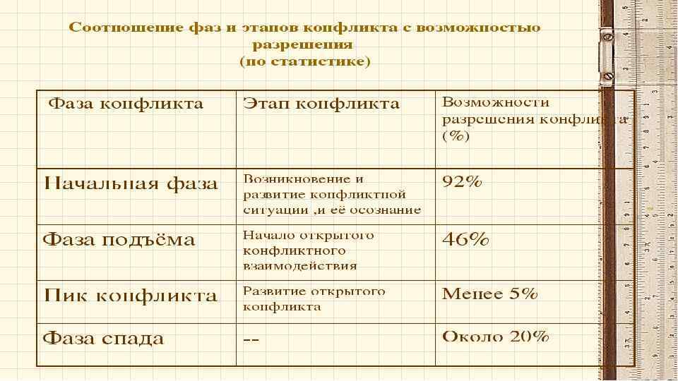 Фазы конфликта 1) начальная фаза; 2) фаза подъема; 3) пик конфликта; 4) фаза спада. • Важно помнить, что фазы конфликта могут повторяться циклически. • Возможности разрешения конфликта в каждом последующем цикле сужаются.