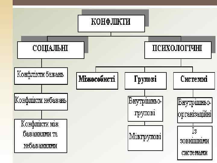 ОСНОВНІ ТИПИ КОНФЛІКТУ Розрізняють чотири основних типи конфлікту: 1. Внутрішньоособовий конфлікт, 2. Міжособовий конфлікт, 3. Конфлікт між особистістю і групою, 4. Міжгруповий конфлікт