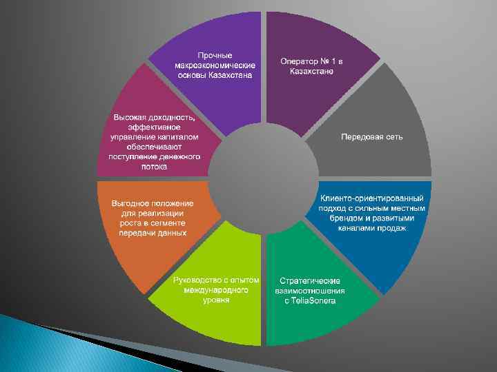 Сотовая связь Сотовая связь в Казахстане осуществляется в форматах GSM (900, 1800), UMTS (900, 2100) и CDMA (450, 800). Уровень проникновения сотовой связи в 2012 году составил 120 %. В формате GSM и UMTS функционируют сотовые операторы: АО «Кселл» (до 2012 года — ТОО "GSM Казахстан ОАО "Казахтелеком") (контрольный пакет её акций принадлежит холдингу Telia. Sonera, приобретённому у АО «Казахтелеком» , скандинаво-турецкому холдингу Fin. Tur принадлежит 47 %) с торговыми марками Kcell и Activ; АО "АЛТЕЛ" (компанией владеет АО «Казахтелеком» ) (доля компании на рынке мобильной связи страны 3, 6 % (декабрь 2012)) с торговыми марками ALTEL 4 G: GSM, PATh. WORD, Dalacom, City. АО «АЛТЕЛ» — первый национальный оператор сотовой связи в Республике Казахстан. ТОО «Ка. Р-Тел» (дочерняя компания российского холдинга «Вымпел-Коммуникации» ) с торговыми марками Beeline Business (ранее K-Mobile); ТОО «Мобайл Телеком-Сервис» с торговой маркой Tele 2 (ранее Neo). Формат CDMA представлен оператором АО «АЛТЕЛ» (принадлежит АО «Казахтелеком» ) с торговыми марками Dalacom, Pathword и City. Операторами сотовой связи поддерживается передача данных в сетях 2 G (GRPS, EDGE), 3 G (EV-DO, HSPA). В некоторых регионах предоставляются услуги передачи данных в сетях Wi. Max. В 2012 году компаниями АО «Казахтелеком» и АО «АЛТЕЛ» была запущена сеть передачи данных 4 G стандарта LTE.
