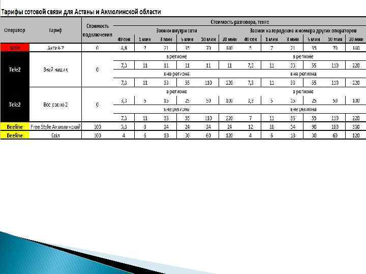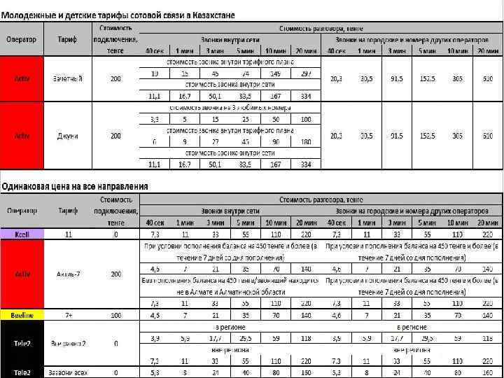 Beeline Всё 690 Звонки внутри сети, в месяц Безлимитно Звонки внутри сети и на других операторов РК, по стандартной тарификации 11 тг/мин SMS внутри сети, в месяц 100 SMS на номера Beeline и Altel, по стандартной тарификации 8 тг SMS на номера других операторов по РК, по стандартной тарификации 13, 44 тг Звонки внутри сети, в месяц 1090 1890 Безлимитно Исходящие звонки на номера других операторов связи по РК, в месяц 200 мин Звонки внутри сети и на номера других операторов связи по РК, по стандартной тарификации 11 тг/мин SMS внутри сети, в месяц * 200 SMS Звонки внутри сети, в месяц Безлимитно Стоимость 1 МБ переданных/полученных данных 20, 16 тг Исходящие звонки на номера других операторов связи по РК, в месяц 350 мин SMS внутри сети, в месяц Free Style Акмолинский Пополнении баланса на сумму от 200 тг до 920 тг один раз в 7 дней или на 920 тг и более один раз в 30 дней Интернет-пакет 1 ГБ предоставляется 1 раз в месяц – 0. 5 ГБ от пакета доступны в период с 7: 00 до 01: 00 следующего дня, 0. 5 ГБ - в период с 01: 00 до 07: 00 утра. Интернет-пакет 10 ГБ предоставляется 1 раз в месяц – 5 ГБ от пакета доступны в период с 7: 00 до 01: 00 следующего дня, 5 ГБ - в период с 01: 00 до 07: 00 утра. 350 SMS Исходящие звонки на номера Beeline и ДОС 0 тенге Звонки на номера других операторов связи по РК, по базовой тарификации 18 Интернет-пакет 20 ГБ предоставляется 1 раз в месяц – 10 ГБ от пакета доступны в период с 7: 00 до 01: 00 следующего дня, 10 ГБ - в период с 01: 00 до 07: 00 утра.