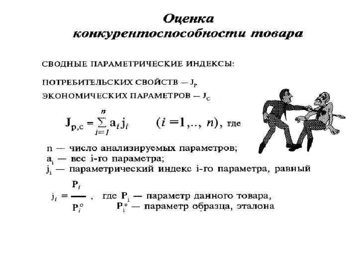 Расчет конкурентоспособности • Показатель конкурентоспособности рассчитывается путем количественного сравнения технико-экономических показателей товаров и услуг с соответствующими показателями образца, как процентное отношение величины каждого параметра.