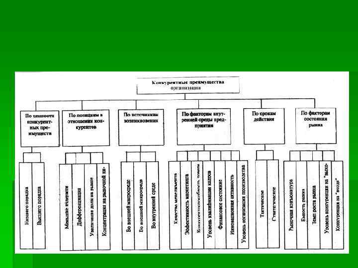 § Стратегическое преимущество – это фактор внешней или внутренней среды организации, который будет использован организацией в конкурентной борьбе в долгосрочный период – более одного года (например, наличие патента, имиджевой товарной марки, квалифицированных кадров и т. д. ).