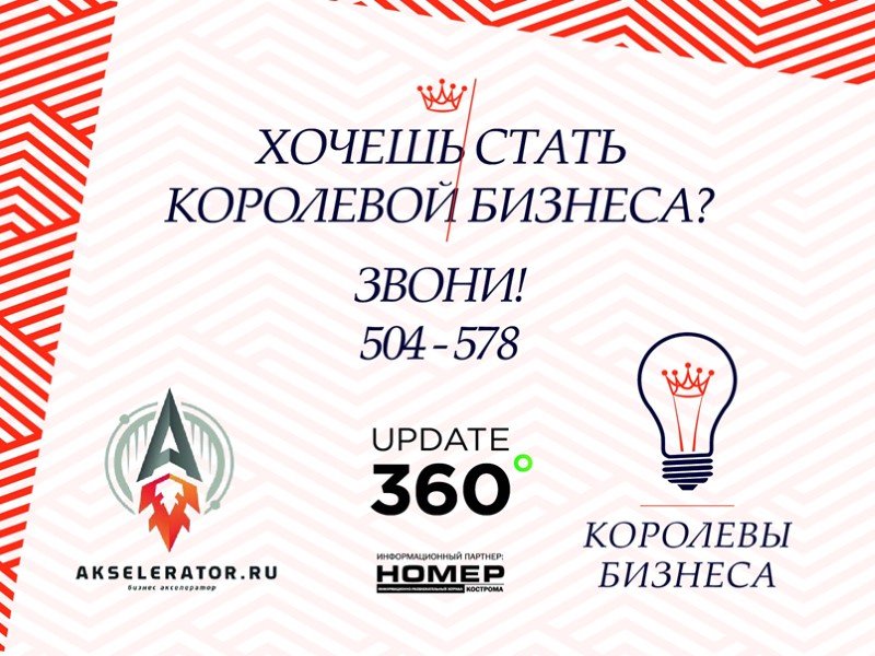 Призы Обучение Королевы Бизнеса по версии жюри в 1 из модулей Akselerator.ru (г. Москва, 4 дня, на базе РЭУ Плеханова, спикеры - ведущие предприниматели России, представители венчурных фондов, федеральные ведущие и продюсеры, возможность посещения таких компаний как Google, QIWI) Королева Бизнеса по версии участниц КостромаWoman получит уникальную возможность пройти программу персональной перезагрузки и создания имиджа Update 360 (в г. Москва с ней будет работать стилист Первого канала, визажисты канала Пятница, тренеры - психологи политиков РФ самого высокого ранга, а также ведущие главных федеральных каналов России). В результате программы победительница получит персонально собранный образ от ведущих специалистов медиа индустрии. Полное обучение Вице-королевы Бизнеса по версии жюри в бизнес-акселераторе на базе Центра продюсирования бизнесов SmartLoft Горький (г. Кострома, 9 недель, коучи и спикеры Akselerator.ru и самые успешные предприниматели Костромского региона)