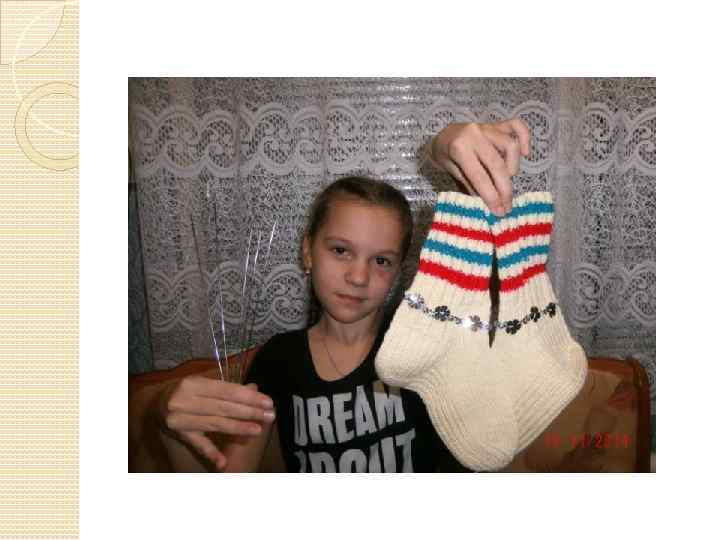 Дорогие Рассказовцы! Вас приветствует ученица 4 «А» класса школы № 1 города Кирсанова Дементьева Карина. Хочу попробовать свои силы в этом конкурсе, и связала вот такие теплые носочки на пяти спицах. Помогала мне в этом моя мама. Она учит меня вязать, как когда-то учила ее бабушка. По рассказам моей мамы, бабушка могла не глядя на рукоделие творить чудеса. Она вязала шали, платки, носки, перчатки и т. д. У нее была самодельная прялка, и прежде чем приступить к вязанию она напрядала большое количество пряжи, потом сучила ее веретеном и наматывала в клубок. Только после этого начиналось вязание. А шерсть бабушка брала от овец и коз, которых выращивала в своем домашнем хозяйстве.