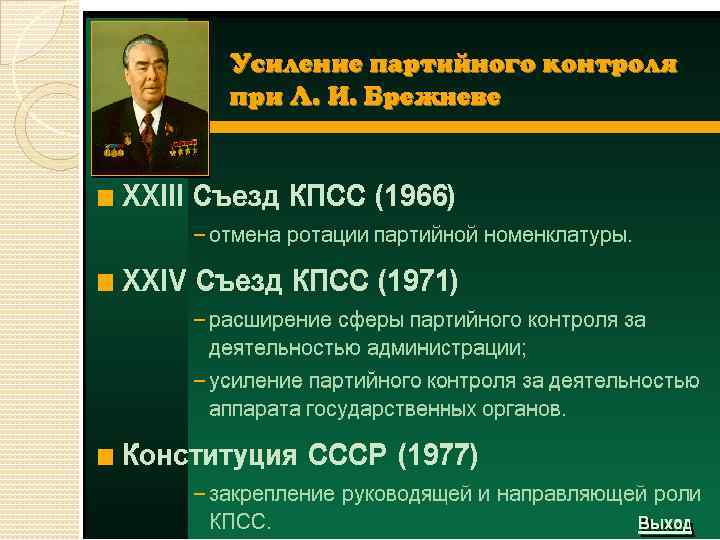 «Золотой век» партийногосударственного аппарата: Лозунг «стабильности кадров» ; Возвращение к прежним структурам управления; Возрастание числа управленцев; Контроль со стороны партаппарата над всеми сторонами жизни общества; Руководящая роль партии; Усовершенствована система льгот.